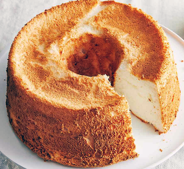 Beat the egg whites and when foamy add the cream of tartar then continue beating until the egg whites form stiff peaks (but do not beat dry). Add the remaining sugar to the beaten egg whites 2 tbsp at a time and beat in until all the sugar is blended then fold in the vanilla. Sift about 40g of the flour mixture over the eggs and fold in lightly. Repeat this process until all the egg mixture has been used up. Turn the batter into an ungreased cake tin or bundt pan (about 25cm diameter) and gently cut through the batter with a knife to remove any large air bubbles.
