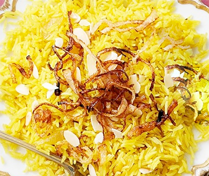 Turn into a warmed serving dish, garnish with the toasted almonds and some deep-fried onion and serve.