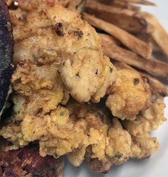 Add oil to a pre-heated frying pan or deep fryer and fry the battered conch until golden brown. Once fried, drain the oil and let cool for 10 minutes.