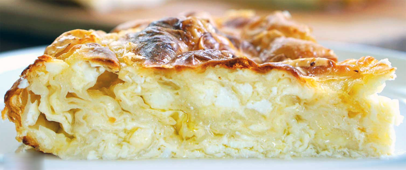 This is a classic Bulgarian breakfast dish made by layering a mixture of beaten egg whites and sirene (a type of white cheese) between sheets of filo pastry before baking in the oven. Typically it is served accompanied by plain yoghurt.