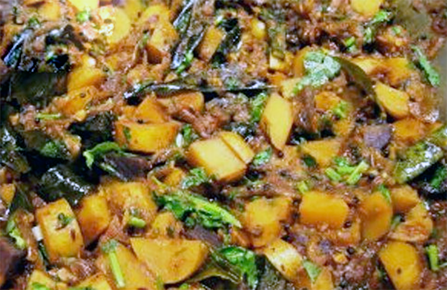 Bufuke is a traditional Ugandan mash of sweet potatoes, beans and peanuts. Here it's served with on onion and tomato sauce.