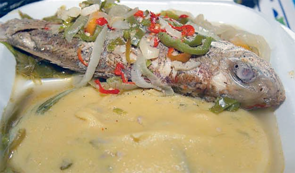 Fish with fungi is the national dish of the Virgin Islands (both British and US). Here I present it with fried fish, but I do present a link to a version for steamed fish too. This US virgin Islands version comes with a creole dipping sauce.