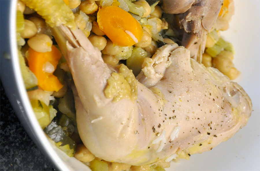 Turn the rice (and the crust at the bottom of the pan) into a bowl and turn the chicken and chickpea stew into another bowl. Serve immediately.