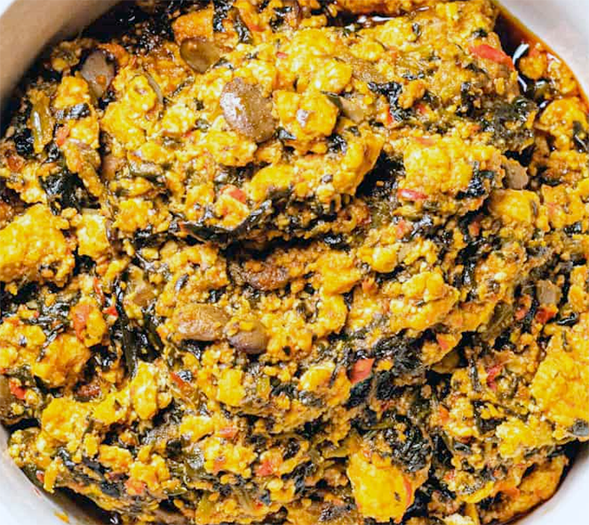 Add the washed dry fish and stockfish along with 100ml more stock and cook for a further 10 minutes. When cooked, transfer into a large bowl, wash the pot and place back on the heat. Add the oil and when hot add ground tomatoes, the remaining onion, ground and the chillies pounded to a paste. Fry for 10 minutes then add the ground egusi (or other seeds) and iru (if available). Stir thoroughly and cook for 5 minutes. Finally add the cooked meats, bitter leaf or greens, crayfish and the remaining stock. Bring to the boil then reduce to a simmer and cook for 15 minutes.