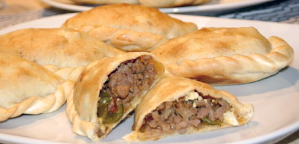 To assemble the empanadas: Fill the pastry discs with a tablespoon of firmly-packed filling, an olive, an eighth of a boiled egg. Fold over the pastry to enclose the filling then seal securely by plaiting the edges.