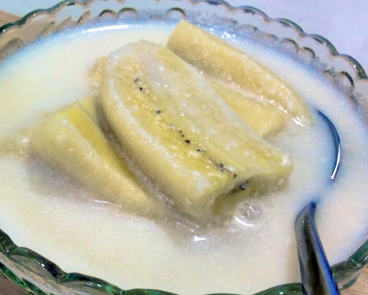 You can either serve the bananas directly in their banana leaf parcels, pouring over the coconut cream for each serving or you can halve, place in a serving bowl and pour over the coconut milk.