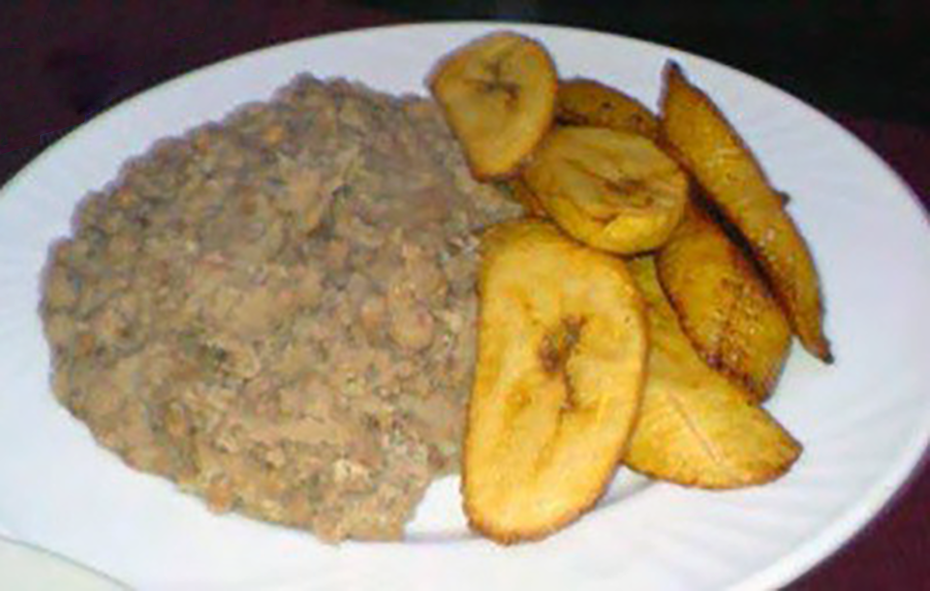 Fryplantain and Beans: A Ghanaian recipe for a classic vegetarian dish of a bean stew served with fried plantain chips.