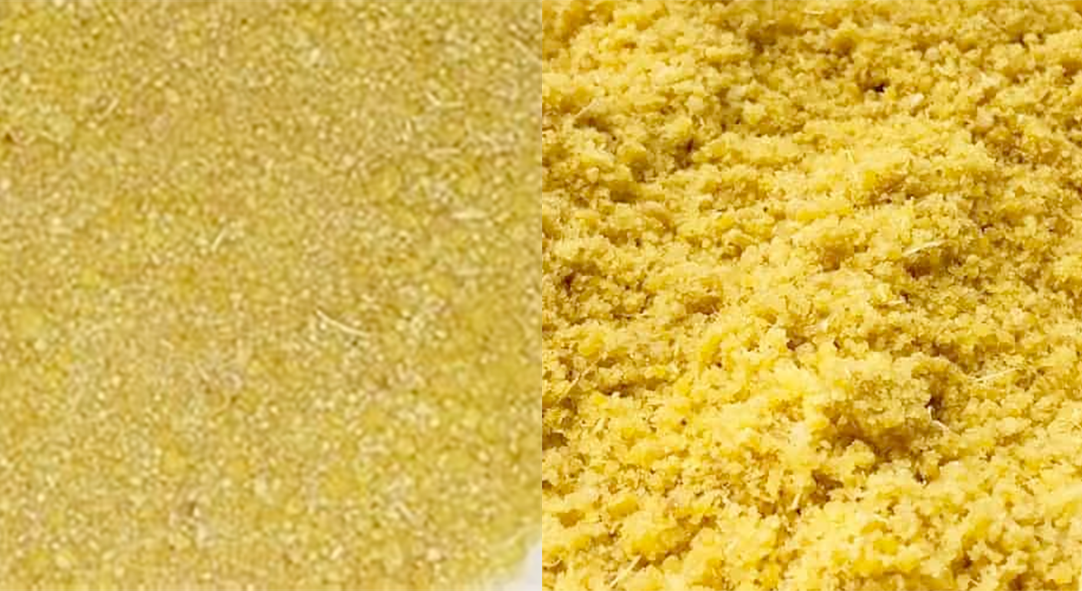 The image shows dried, toasted farine on the left and steamed farine on the right.