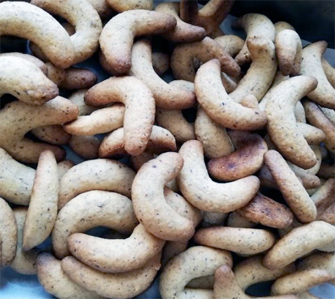 Hazelnut Crescents is a traditional Turkmenistani recipe for a classic biscuit (cookie) made from a flour and butter pastry bound with eggs that's flavoured with hazelnuts and cut into crescents before baking. The full recipe is presented here and I hope you enjoy this classic Turkmenistani version of: Hazelnut Crescents.