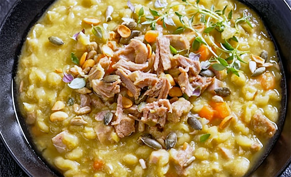 Remove the ham hock and set aside to keep warm. Take the pea mixture off the heat and allow to cool slightly then blend in batches, processing each batch until smooth.