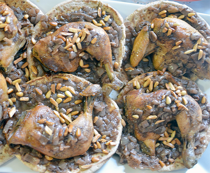 Muskahan is a traditional chicken recipe from Jordan, Palestine and other nearby areas of the Levant (Syria and Lebanon in particular). It's served both at family gatherings and as a street food, with the bread serving as a sandwich. It consists of three parts: a flat bread named taboon, caramelized onions and a piece of chicken marinated with sumac and other spices. The whole dish is served topped with toasted pine nuts or almonds, which provide a needed crunch to the final dish.