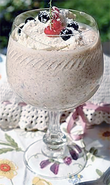 Mix all ingredients, let stand in the fridge for 10 minutes, then garnish with berries (I've used Alpine strawberries from my container garden), bilberry syrup or go all modern with a drizzle of chocolate sauce.