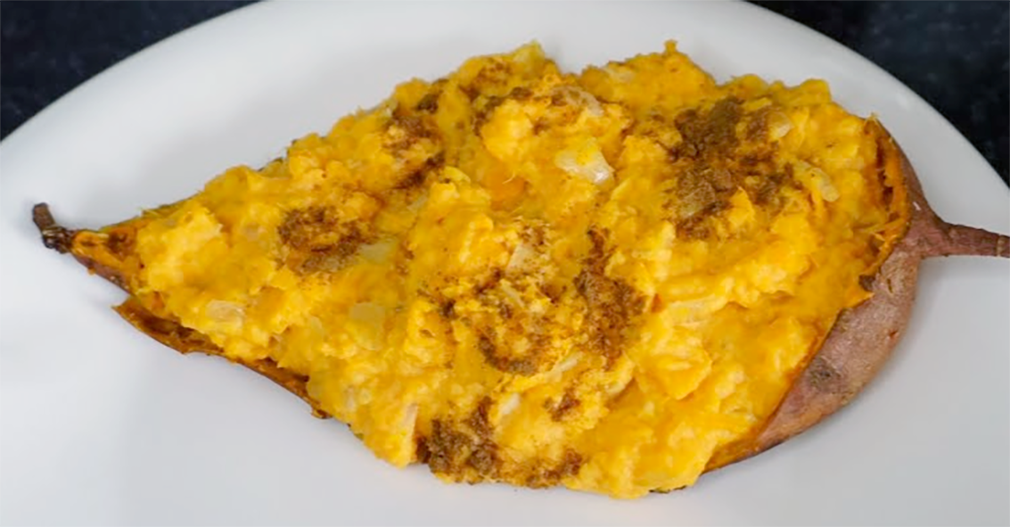 Use this mixture to stuff the sweet potato skins, arrange on a baking tray then return to the oven and bake for an additional 10 minutes, until lightly browned on top and heated through.