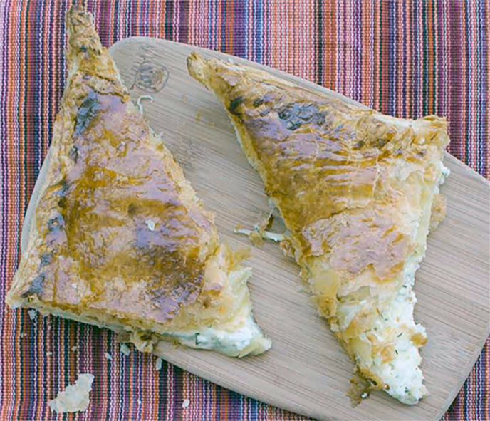 Place about 100g of the cheese mixture in the centre of the dough rectangle and spread out to within 5cm of the of each edge. Fold the rectangle, envelope style, by taking each of the 4 ends and firmly pushing them, one at a time, into the centre of the parcel. Pinch together the open ends so that the cheese is completely sealed inside. Now brush the pie surface very lightly with oil. Continue this process with the remaining cheese mix and pastry.