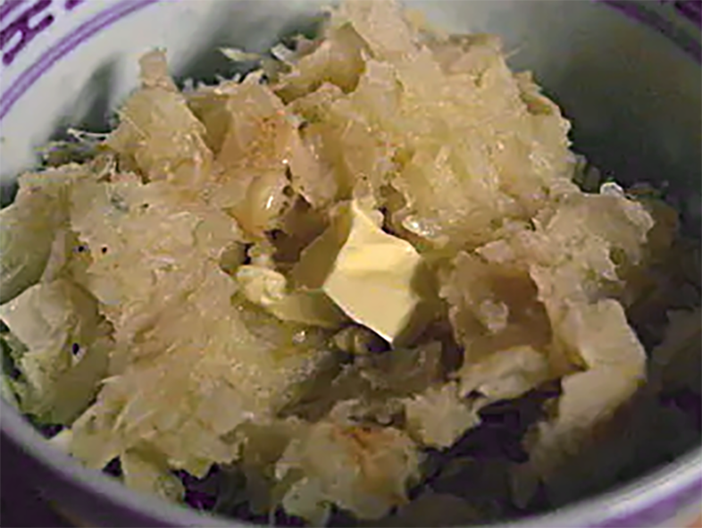 Drain the roots and place in a large bowl then add the butter and sour cream. Using a potato masher mash the mixture until completely smooth. Use a strong metal spoon beat the mixture, adding milk until you have a smooth texture (they will not be completely smooth as the bellflower roots are a little fibrous). Season to taste with salt and black pepper and serve hot in a bowl. If desired, garnish with a little melted butter.