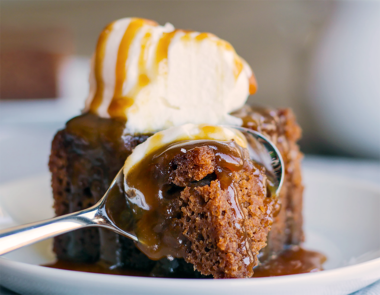 Turn the grill on to a moderate heat. Make holes in the cake with a knife – just large enough to allow the sauce to soak in to the sponge – and pour over the remaining sauce. Grill for just long enough to crisp the top a little. Serve with a great deal of double cream or vanilla ice cream.