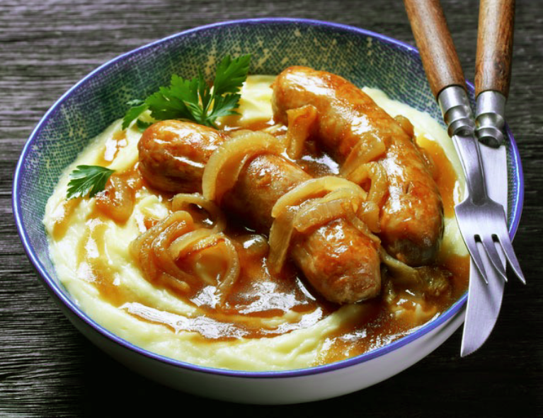 To Serve: Place a generous scoop of mashed potatoes on each plate then top with the sausages.