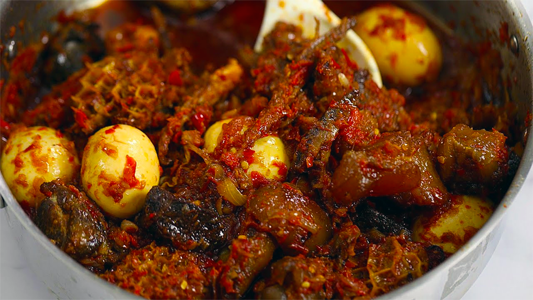 Obe Ata Dindin (Nigerian Red Sauce) is a traditional Nigerian recipe for a classic dish of mixed meats in abell pepper and red palm oil base with smoked fish, fermented locust beans and hard-boiled eggs. The full recipe is presented here and I hope you enjoy this classic Nigerian version of: Nigerian Red Sauce (Obe Ata Dindin).