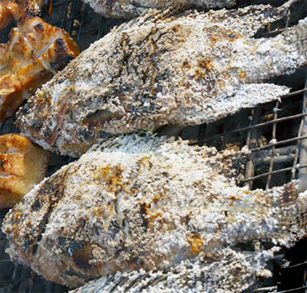 In the meantime pre-heat your barbecue. Place the fish over the hot coals and cook for about 15 minutes per side or until the fish is cooked through.