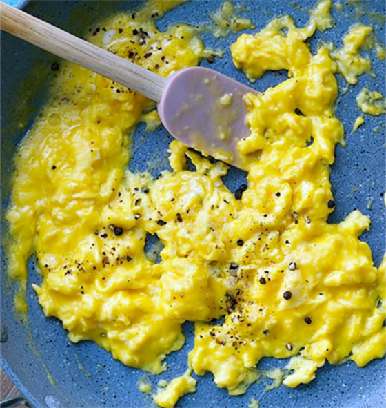 When the egg is nearly cooked remove from the heat and stir in another teaspoon of butter. The eggs will continue to cook in the residual heat of the pan to produce a smooth and creamy finish.