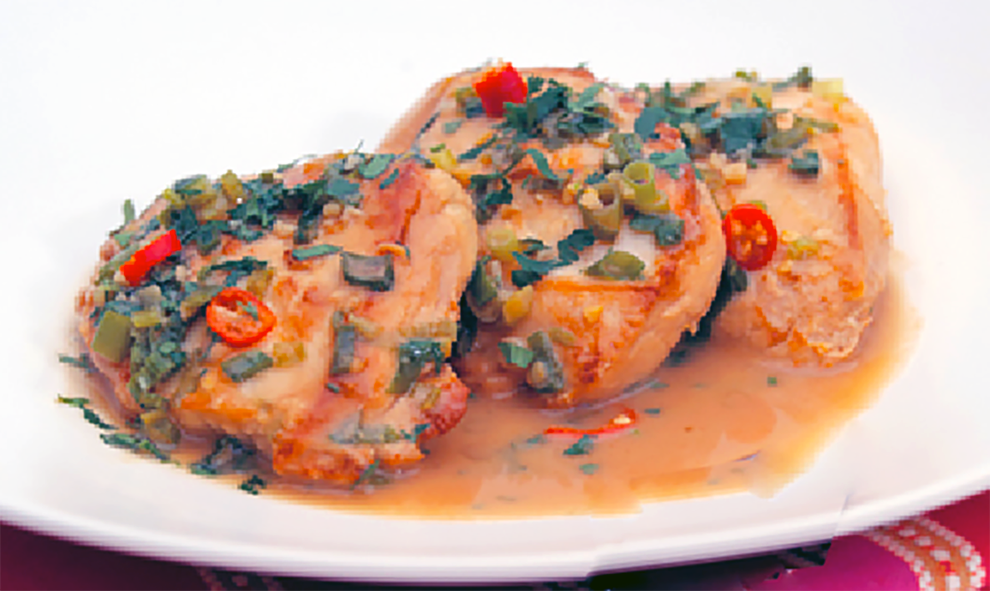 Transfer the chicken to a serving dish and pour over the sauce. Garnish with the coriander leaves and chopped peanuts and serve accompanied by plain white rice.