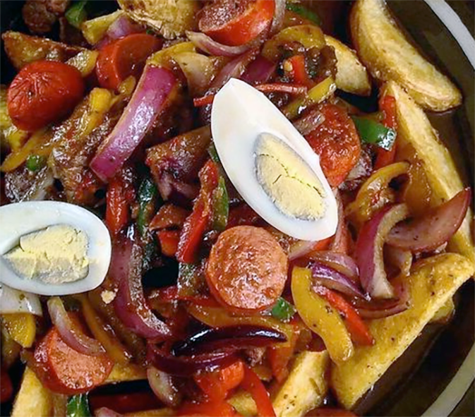 This dish is a carnivore’s dream, featuring beef, sausage, and chips (fries) topped with a spicy sauce.