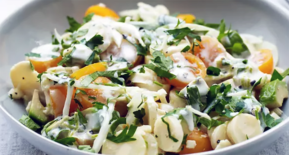 This is a Brazilian-style heart of palm and avocado salad from New Caledonia. The main difference being that a coconut cream dressing is used here. This is only one of the heart of palm salads found in New Caledonia, the other common type being hearts of palm and prawn (salade de Palmients et Crevettes).