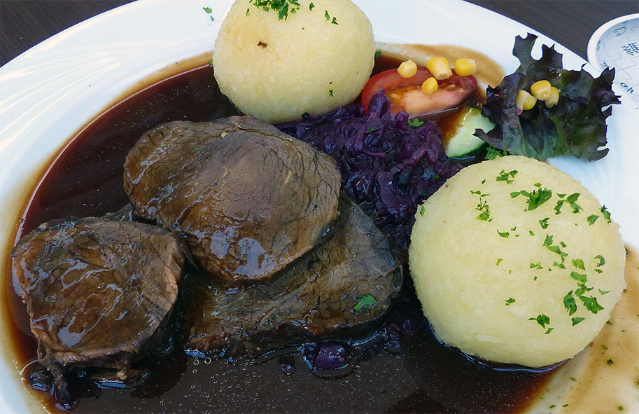 Sauerbraten is a traditional German recipe for a classic stew of marinated beef served with the sauce made with ginger snap biscuits (cookies) thickened to a gravy. The full recipe is presented here and I hope you enjoy this classic German version of: Sauerbraten.