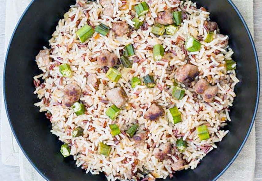 Rice and cassava are the two main staples of Sierra Leone, with Thai jasmine rice the preferred rice cultivar. In a waste-not food culture, leftover rice is cooked as fried rice in a variety of ways, often vegetarian but also containing leftover and cheap meat choices. Here the rice is combined with okra and chipolata-style sausages to make a quick and satisfying meal. Use this recipe as a guideline and invent you own dish. For more colour you could use bell peppers and green beans. For a vegetarian version substitute the sausage pieces with mushrooms.