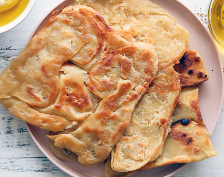 Put a wide frying pan over medium heat and drizzle with a little oil. On the oiled work surface, take a roti and use your fingers to push and stretch it back out into a 15-20cm circle. Sit in the pan and fry for a minute or two on each side – it’s ready when crisp and covered in brown spots.