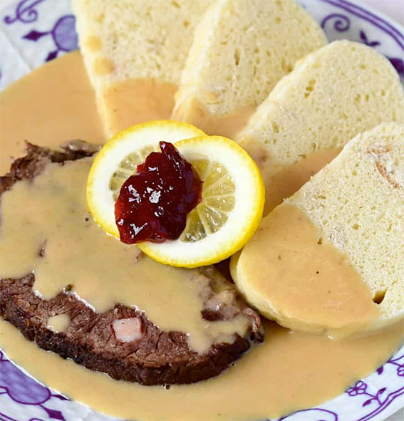 Svíčková na smetaně is a traditional Czech recipe for a classic dish of larded and roast beef served with a gravy made from vegetables and the pan drippings in a vinegar and cream base. The full recipe is presented here and I hope you enjoy this classic Czech version of: Svíčková na smetaně.
