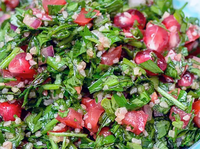 Mix the herbs, onion, pomegranate with the bulgur wheat and tomato mixture. Add the pomegranate molasses and extra-virgin olive oil and mix again. Season to taste.