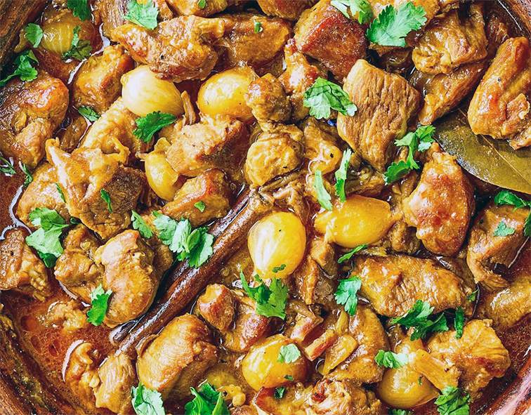 Trim any excess fat and sinew from the lamb then cut into 3cm cubes. Combine half the butter and the oil in a heavy-bottomed pan and when hot use to fry the onion gently for about 10 minutes, or until translucent. Increase the heat to medium-high and add the lamb. Continue cooking, stirring frequently, until the meat is nicely browned on all sides. Add the water, spices and chopped dates then season with salt and black pepper. Bring to a boil, reduce to a simmer, then cover and cook over low heat for about 60 minutes, or until the lamb is tender.