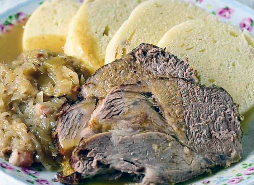 Serve a slice of the roast pork accompanied by braised sauerkraut, and slices of bread dumplings (houskové knedlíky). Pour the gravy in the centre, allowing it to partially cover the meat, sauerkraut, and dumplings.