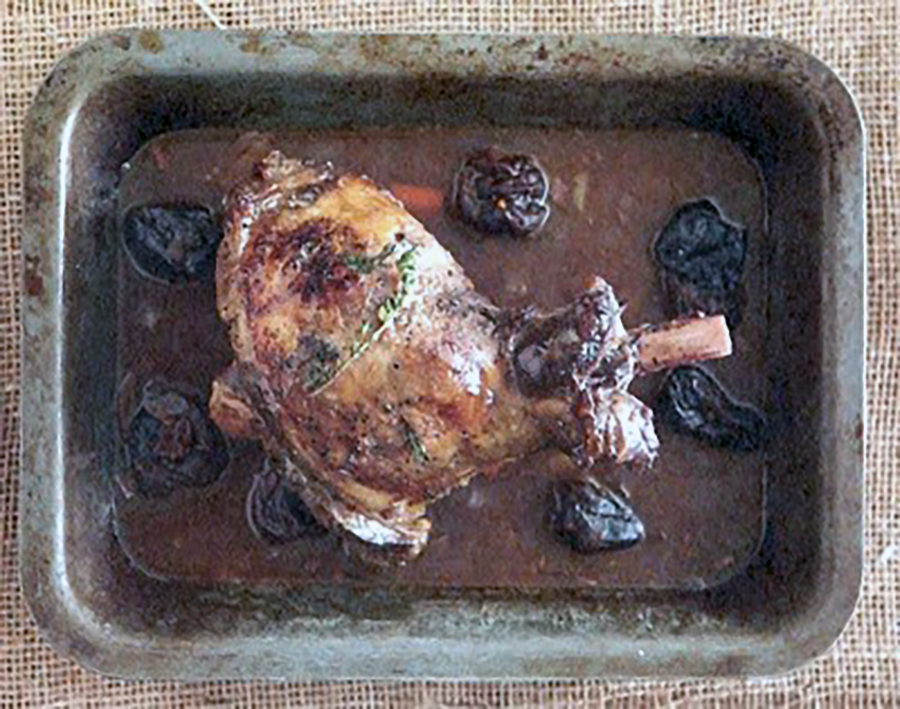 Coes Cig Dafad wedi Rhostio gyda Llysiau, Mêl Grug a Phrŵns (Roast Leg of Mutton with Heather Honey and Prunes)