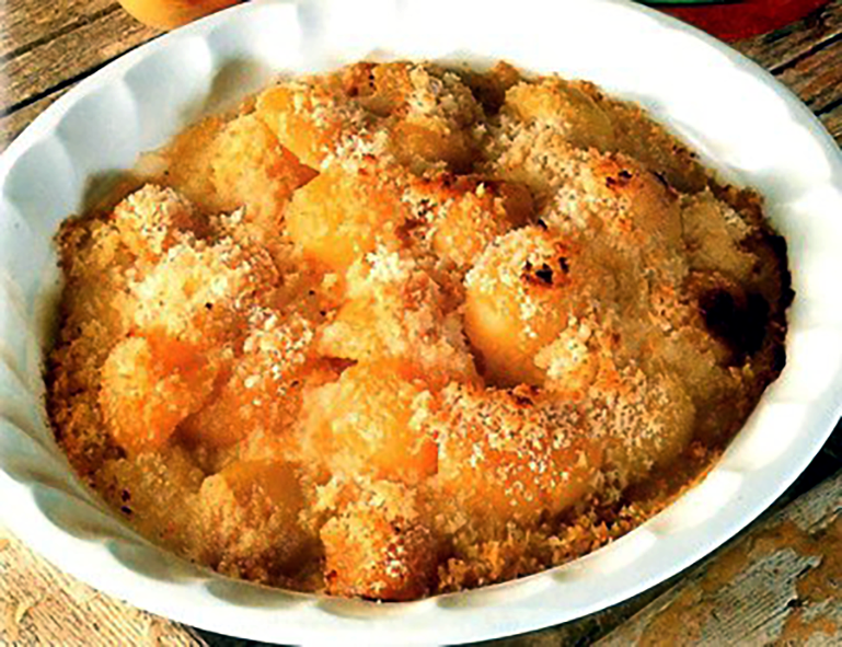 Apricot Betty: A British recipe for a dessert made from a tinned apricot base baked with a sugar, breadcrumb and butter topping.