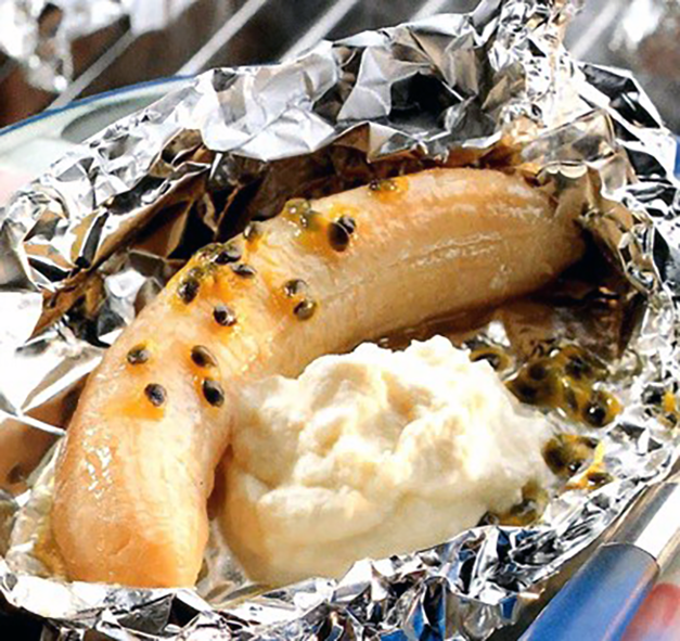 Baked Bananas a Classic British recipe for a barbecue barbecue dessert of bananas baked in a foil parcel with passion fruit pulp, orange juice and orange liqueur that's served with an orange cream.