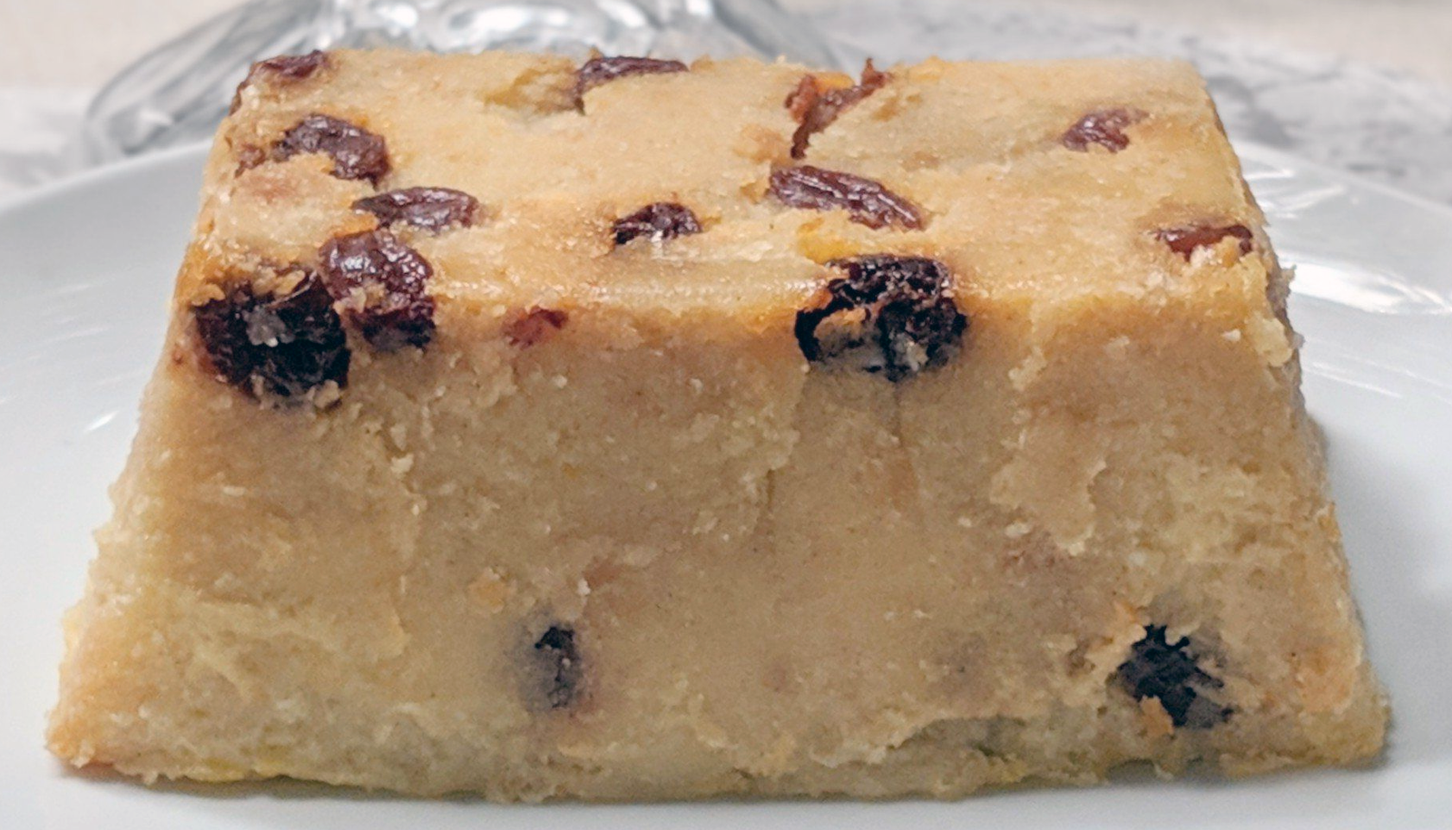 Cabinet pudding, also known as chancellor's pudding or Newcastle pudding, is a traditional English steamed, sweet, moulded pudding made from some combination of bread or sponge cake or similar ingredients in custard, cooked in a mould faced with decorative fruit pieces such as cherries or raisins, served with some form of sweet sauce.