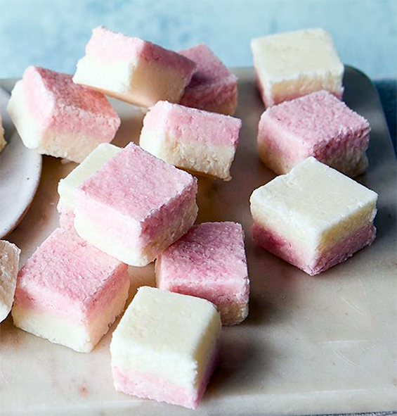 Coconut Ice: A British recipe for a Christmas treat of candy bars made from a blend of granulated sugar, milk and desiccated coconut coloured red with food colouring.