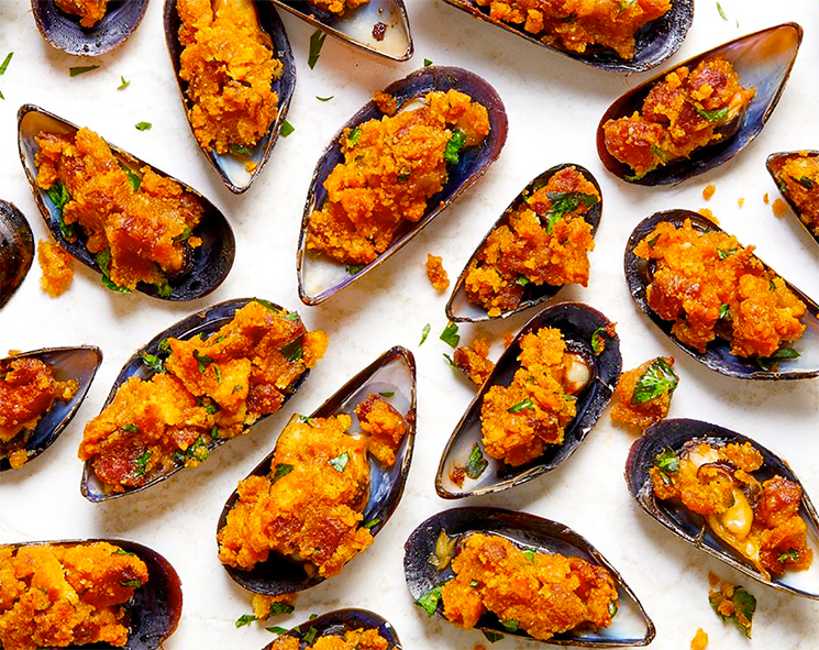 Transfer the chorizo mixture to a large bowl. Add the cornbread crumbs, parsley, and ¼ cup reserved mussel stock. Toss, adding more stock 1 tablespoon at a time if needed, until mixture is slightly wet and mouldable.
