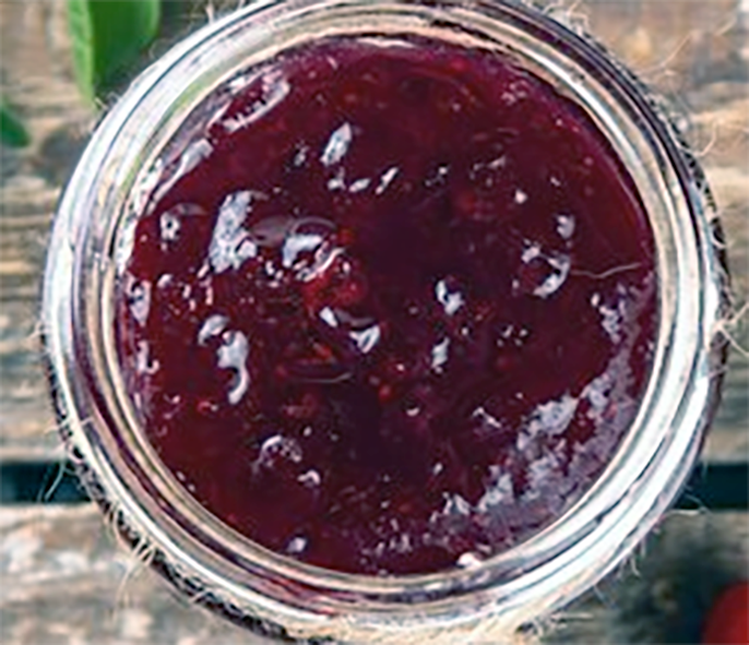 Add the prepared Cornelian cherries and cook, stirring frequently, for five minutes. Test for the setting point by spooning a little of the jam onto a plate that has been chilled in the fridge. If the jam forms a skin when you move it with your finger then it's reached the setting point. If it does not then you should continue boiling for 5 more minutes and test again.