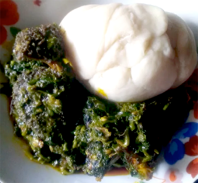 Efere Usung Udia, also known as Afang soup, is a traditional Nigerian dish made with Afang leaves and often served with pounded yam.