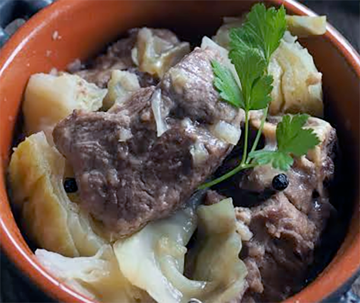 Using a large pan (a cast iron Casserole [Dutch oven] is ideal) add a layer of meat, fat side down. Season with salt and black pepper then add a layer of cabbage. Keep on layering the meat and cabbage, seasoning each layer as you finish it. Some people like to scatter 2–4 tbsp of flour between the layers to thicken the sauce. Tie the black peppercorns in a muslin bag and nestle in the centre of the pot.