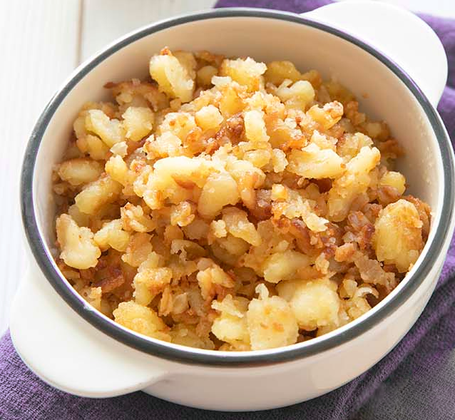 Add a few pieces of butter and sprinkle with sugar then continue stirring, breaking up any large dough pieces. Allow the ingredients to brown then tip out onto a plate and garnish with fruit or other ingredients.