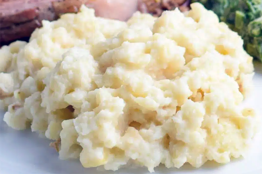 Drain the vegetables and place in a large bowl then add the butter and sour cream. Using a potato masher mash the mixture until completely smooth. Use a strong metal spoon beat the mixture, adding milk until you have the creamy texture you desire (do not over-beat or your potatoes will become gloopy). Season to taste with salt and black pepper and serve hot.