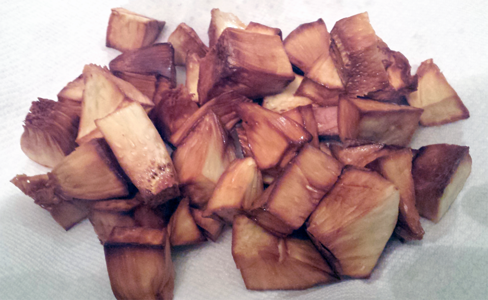 Heat the oil in a deep fryer, large saucepan or wok. When the oil is hot (about 180°C) add the breadfruit pieces and fry for 5-6 minutes per side or until golden brown and crispy.
