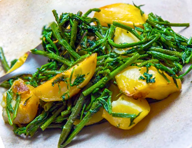Hop Shoots with Fried Potatoes is a traditional British recipe for a classic light lunch dish of fried hop shoots, onions and fried potatoes. The full recipe is presented here and I hope you enjoy this classic British version of: Hop Shoots with Fried Potatoes.