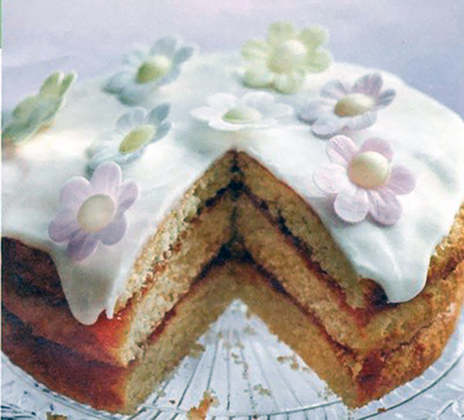 Layer Cake: A British recipe for a cake made from three layers of white sponge cake sandwiched with apricot jam and served spread with white vanilla icing decorated with candied nuts, wafer daisies and dragee balls.