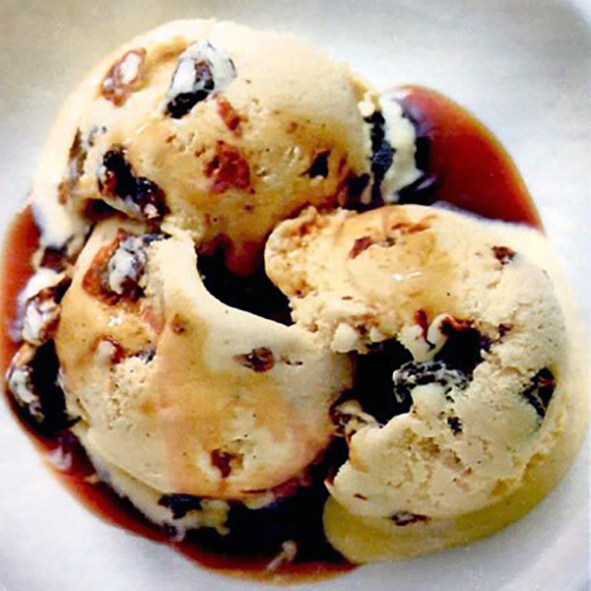 Stir the soaked raisins and their soaking liquid into the ice cream just before you finish churning or before you freeze for the last time.