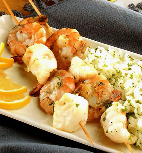 Thread the marinated fish and prawns onto 4 skewers (discard any left-over marinade). Cook the skewers by barbecuing over hot coals for between 10 and 15 minutes, turning the kebabs frequently.